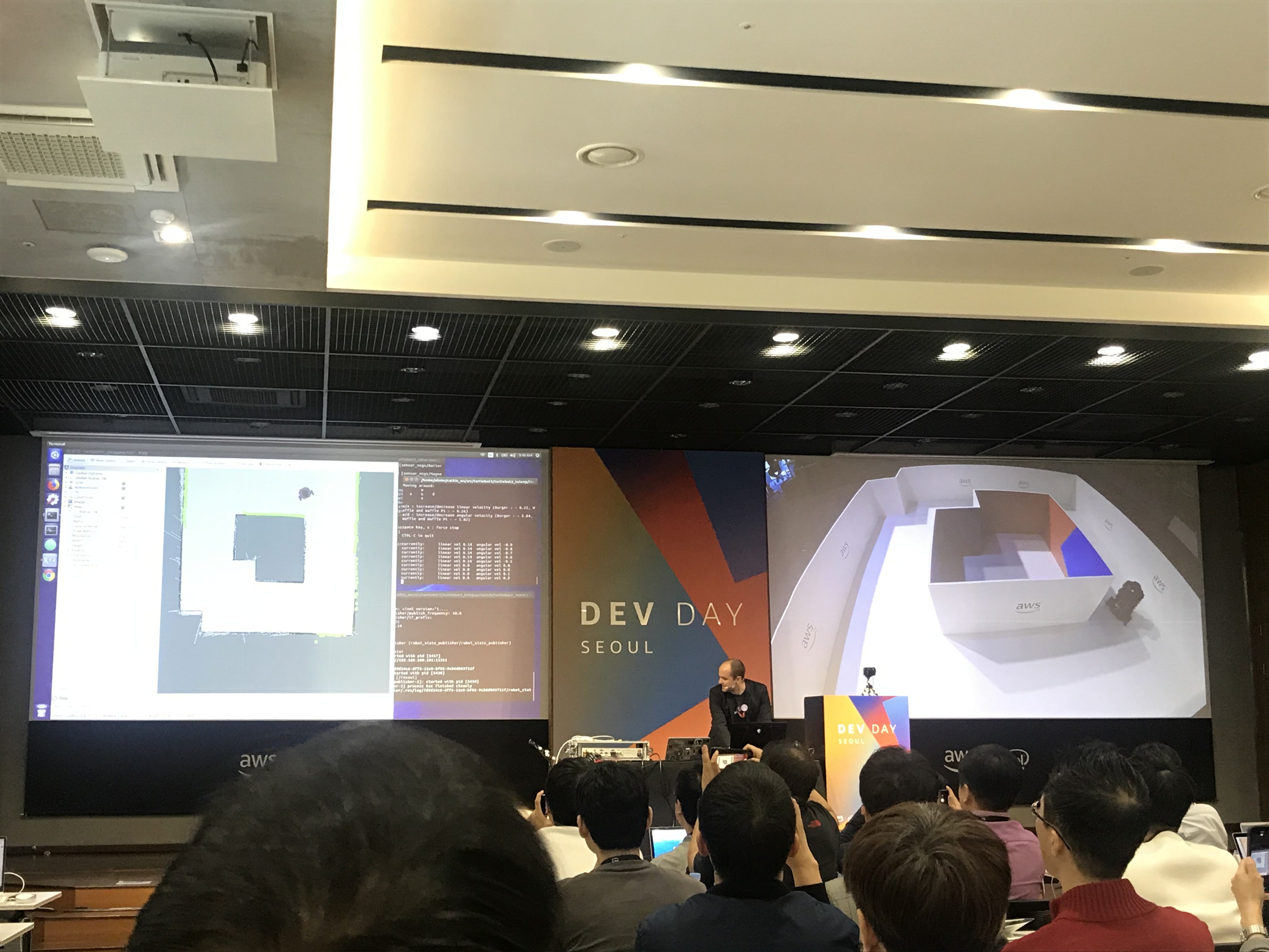 Olivier Klein 신기술 부문 책임자가 발표하였고, AWS의 개발 트렌드와 각 교육에 대한 요약, AI 로봇 시연이 이루어졌다.
