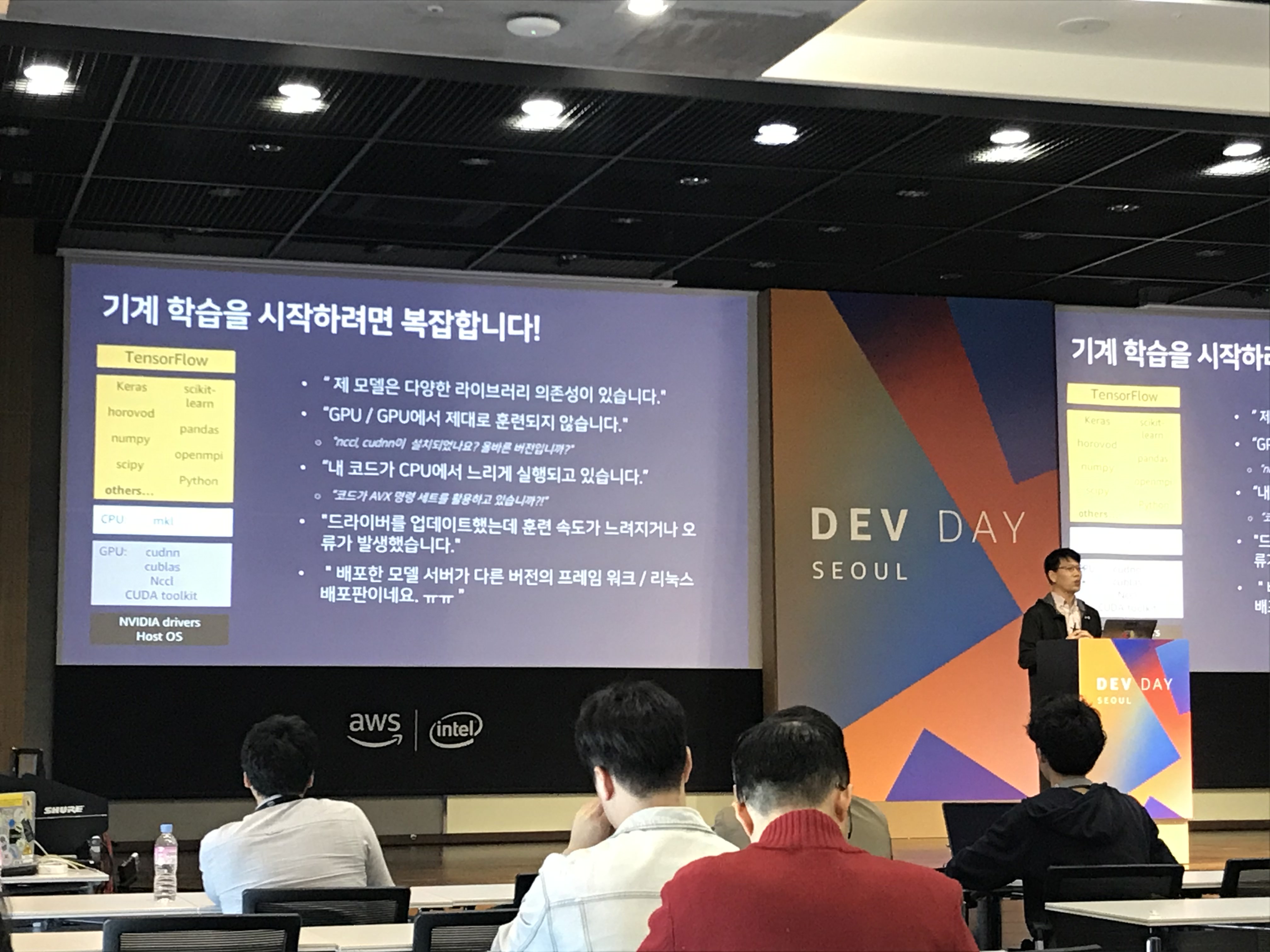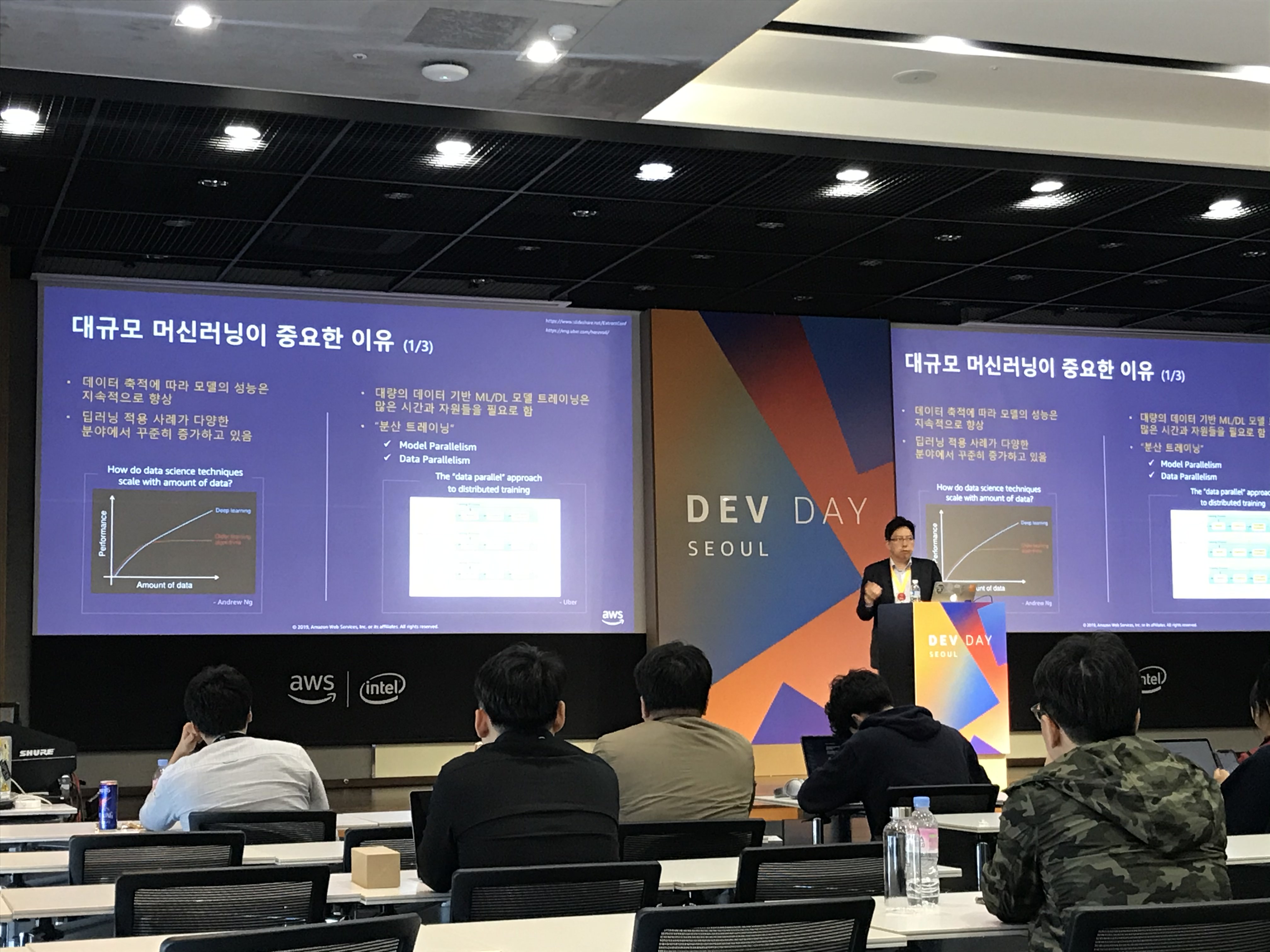 AWS에서 서비스 중인 SageMaker에 대한 소개와 설명이었다. 요즘 IT업계의 가장 큰 관심이 머신러닝/딥러닝인데 개발자들이 개인적으로 개발하고 테스트하기에는 비용에 대한 문제가 크다. SageMaker를 사용하여 가장 저렴한 인스턴스와 2주간의 학습을 시키고 테스트 하였을 때 발생하는 요금 (8달러정도)을 보여주고 소개하였다.