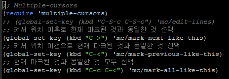 같은 단어를 선택하는 것과 같은 심볼 등 다양한 추가 기능이 있지만 현재 나는 기본적인 멀티 라인 기능과 선택된 것과 동일한 것들을 선택하는 기능만 사용할 것이기 때문에 .emacs에 다음과 같이 세팅하였다.